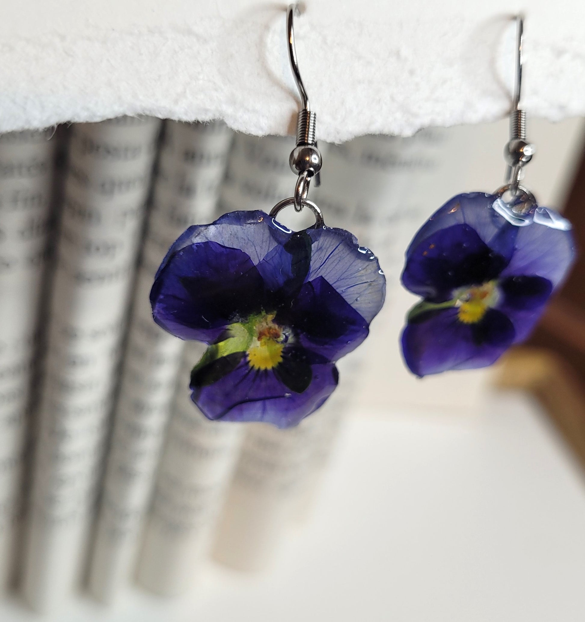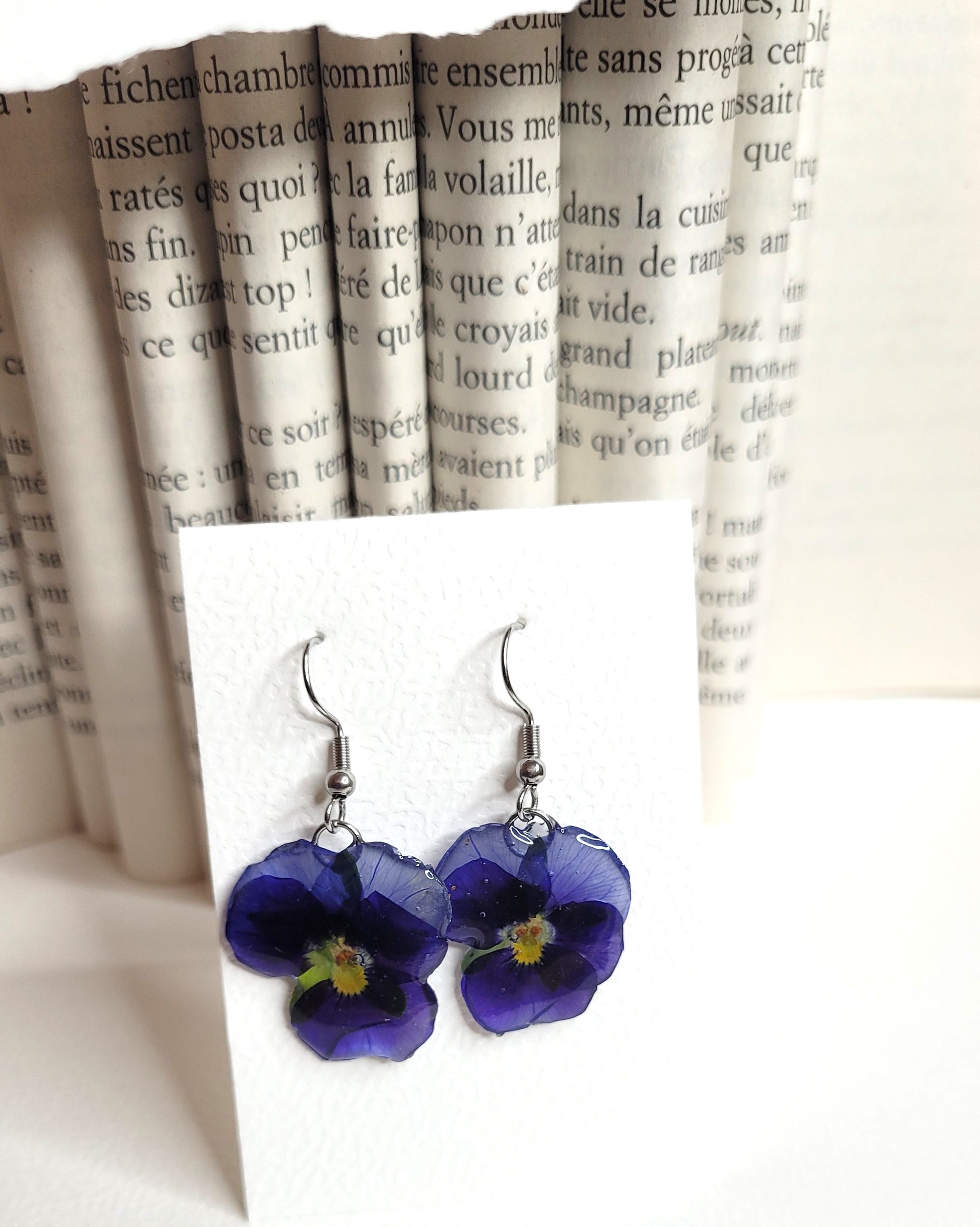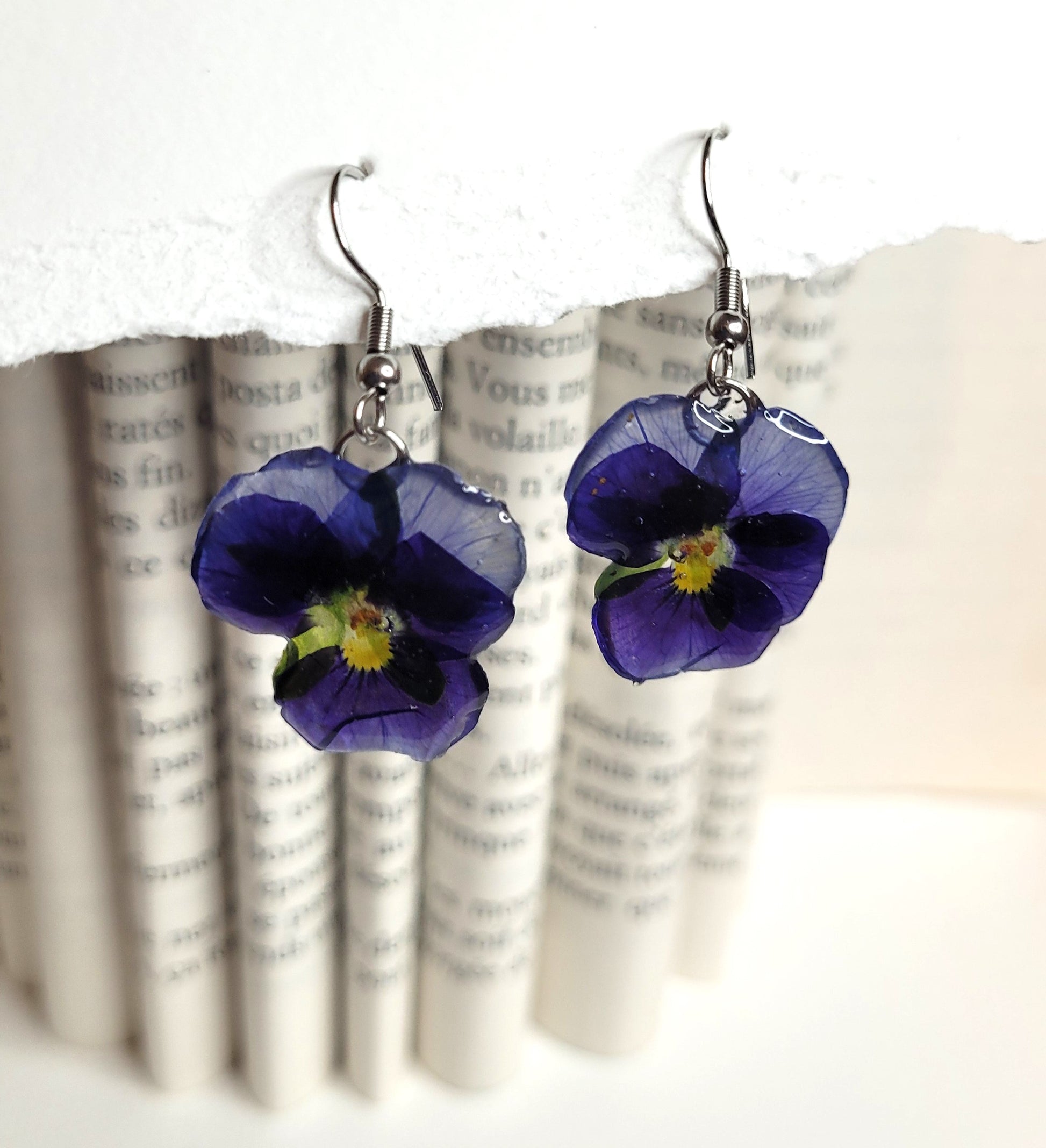 Ces boucles d'oreilles artisanales sont réalisées à partir de véritables pensées délicatement séchées puis résinées à la main.